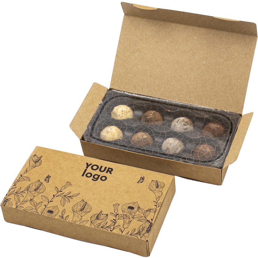 Scatola di cioccolato con deliziosi tartufini al cioccolato. La scatola è realizzata in scarta color naturale e viene personalizzata completamente secondo i tuoi desideri.