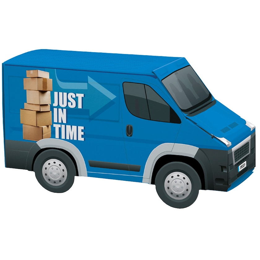 Furgone personalizzato pieno di caramelle o cioccolatini. Questo furgone è realizzato in carta certificata FSC e viene stampato interamente secondo i tuoi desideri. Puoi scegliere liberamente tra i contenuti seguenti: Mentos chewy candy (36,5 grammi, conservabile per 12 mesi), Ritter Sport chocolate bites (60 grammi, conservabile per 6 mesi) o Lindt Lindor milk balls (50 grammi, conservabile per 6 mesi).