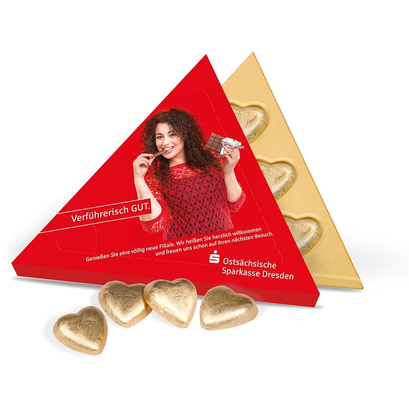 Scatola di cioccolatini piena di cuoricini di cioccolato Lindt. Scegli tra involucro di alluminio dorato oppure rosso. Scarica il modello di stampa e crea la tua scatola di cioccolatini personalizzata!