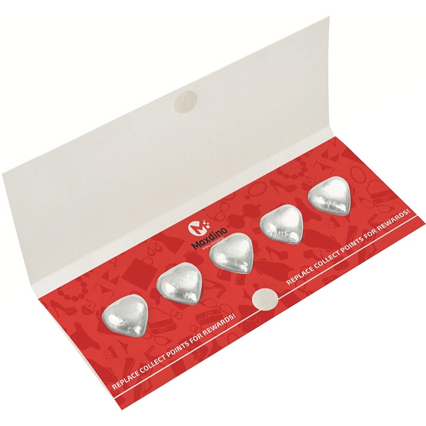 Scatola di cioccolatini con cinque cuori di cioccolato al latte. L'intera scatola viene personalizzata secondo i tuoi desideri. Scegli tra i colori argento, oro e lamina rossa.