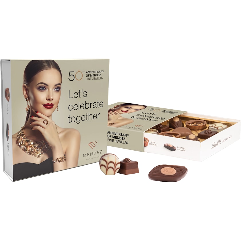 Nove esclusive praline dalla produttrice di cioccolato Lindt in una confezione regalo. La scatola è dotata di un coperchio trasparente con un inserto personalizzabile secondo i vostri desideri.