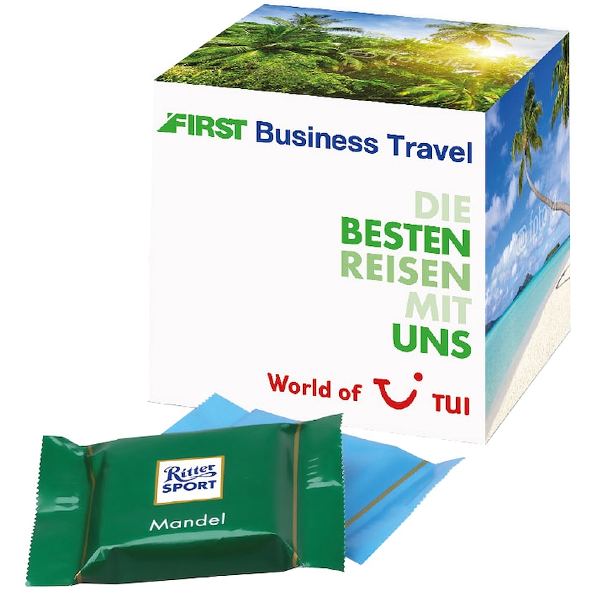 Piccola scatolina di cartone con 5 Ritter Sport Quadretties. Ogni lato della confezione può essere personalizzata a tuo desiderio. I cioccolatini sono disponibili in diversi gusti (Alpenmilch, Halbbitter, Knusperflakes och Mandel).