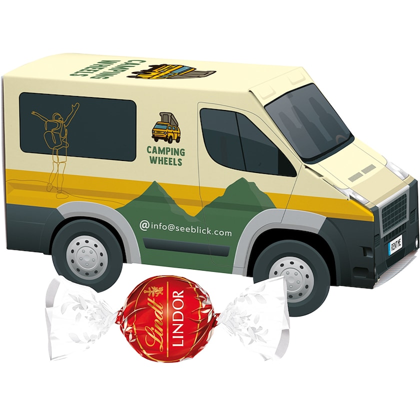 Furgone contenente 3 fantastici cioccolatini Lindt Lindor. La confezione è realizzata in carta certificata FSC, L'intera parte esterna viene personalizzata secondo i tuoi desideri.