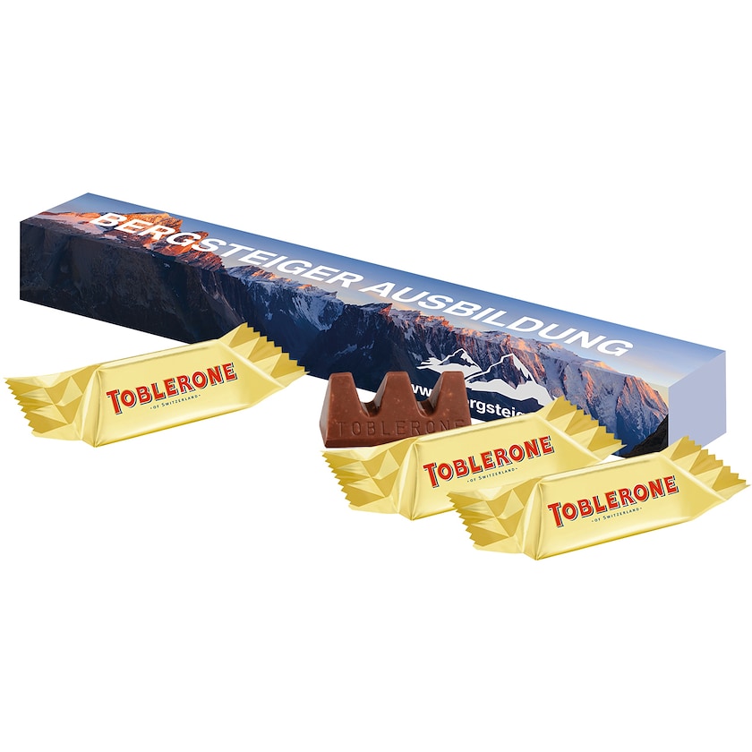 Scatola di carta con design personalizzato contenente tre Toblerone Mini. Un gustoso regalo per clienti e dipendenti.