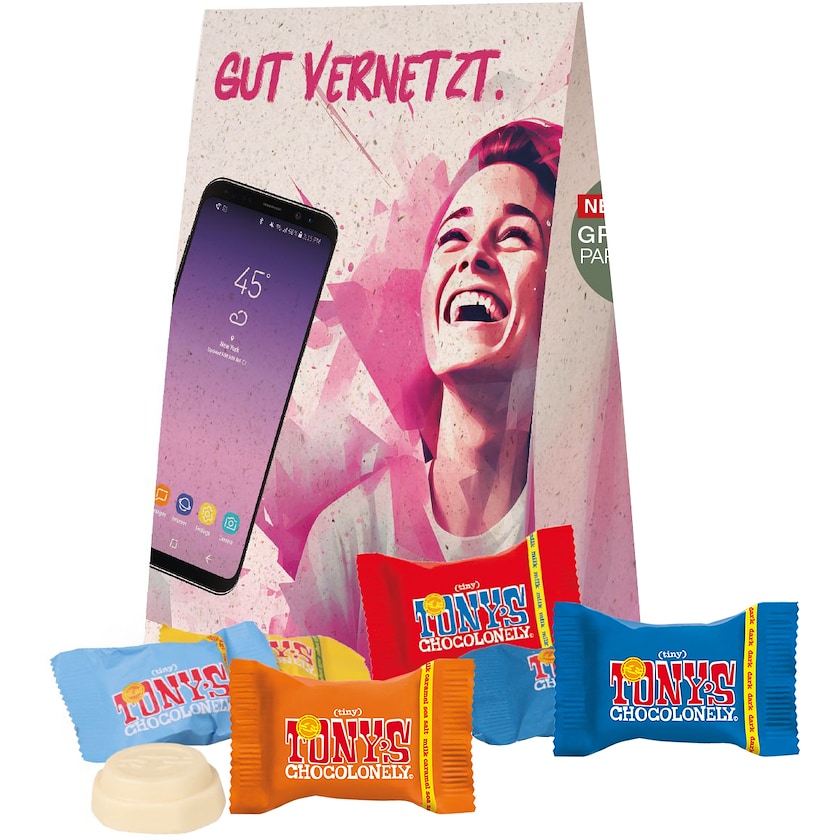 Scatola ecologica con 8 Tiny Tony's in gusti misti. La scatola di carta è realizzata in carta erba ecologica e viene personalizzata secondo i tuoi desideri.