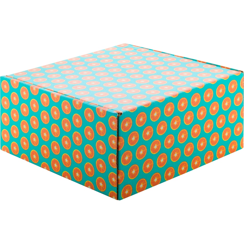 Grande scatola quadrata in carta ondulata. La scatola è dotata di un adesivo per chiusura rapida. L'intera parte esterna della scatola è personalizzata secondo i tuoi desideri. Consegnata piatta, ovvero smontata.