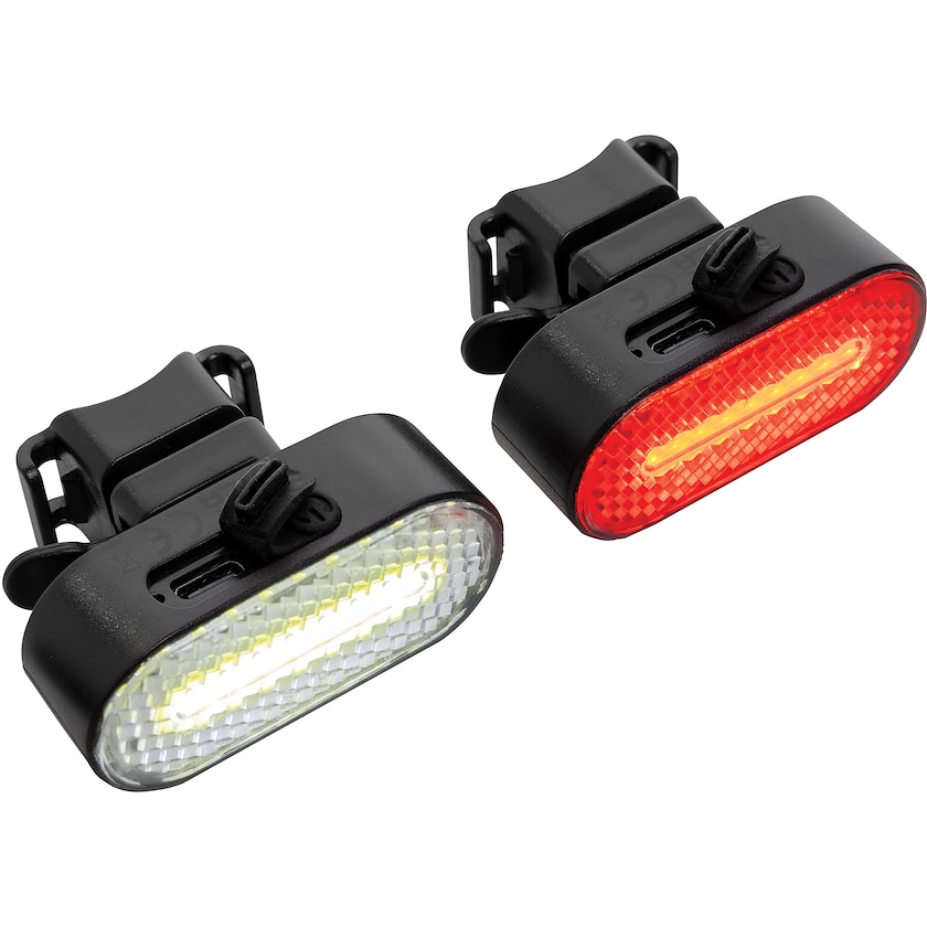 Faro anteriore e posteriore per bici ricaricabile. I fari sono realizzati in ABS riciclati. Si ricaricano in un'ora attraverso un cavo tipo C e hanno autonomia d'uso di 2,5 ore. I fari hanno cinque livelli di luminosità. Impermeabilità IPX.