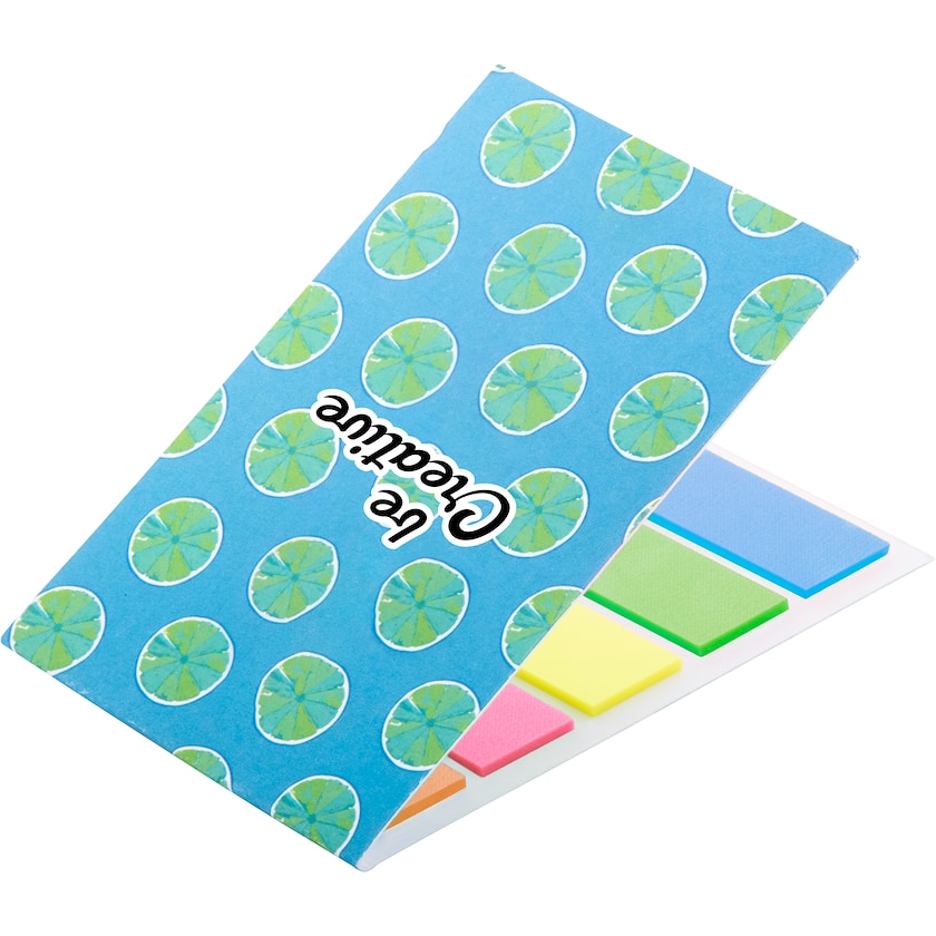 Segnapagina in cinque colori diversi con copertina in carta. I segnapagina sono in totale di 100 pz e hanno dimensione 44 x 12 mm. La parte esterna della copertina viene personalizzato con stampa digitale.