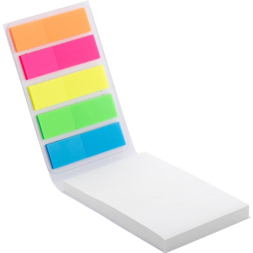 Set con segnapagina e blocco appunti. I segnapagina sono in totale 100 pz divisi in cinque colori diversi. Ogni segnapagina misura 50 x 75 mm. Il blocco appunti contiene 50 pagine bianche con colla sul lato corto. La parte esterna della copertina viene personalizzata con stampa digitale secondo i tuoi desideri.