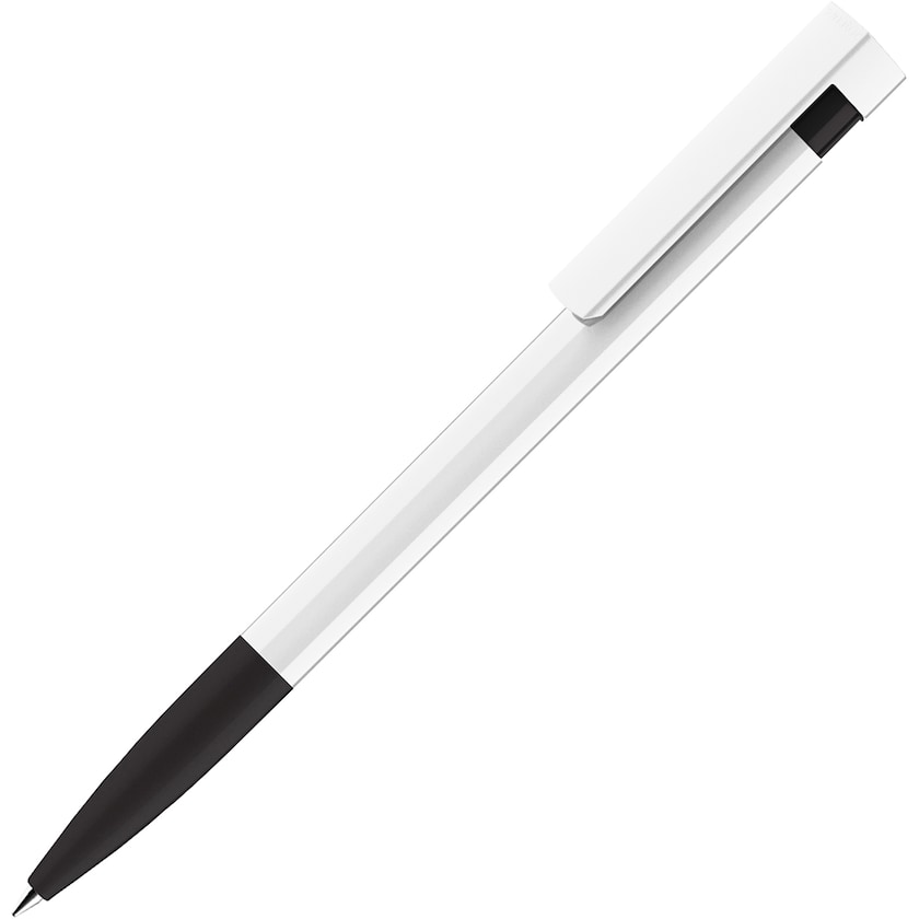 Penna promozionale d'alta qualità con il corpo bianco e dettagli colorati. La penna è disponibile con inchiostro nero e blu. Una penna elegante dal design fino!