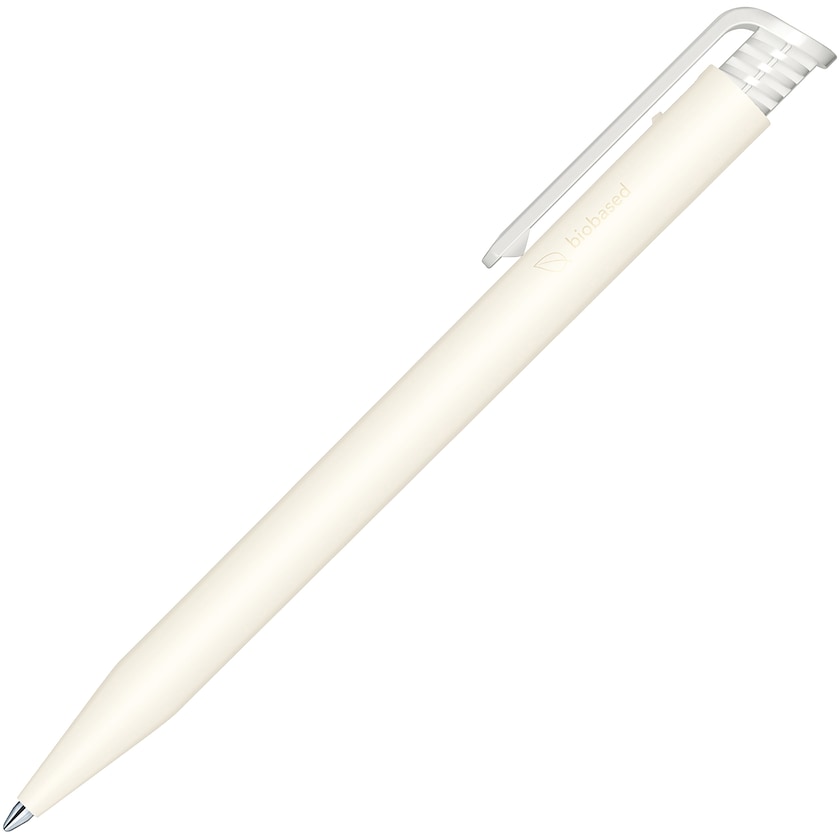 Penna ecocompatibile di alta qualità. La penna è realizzata in bioplastica e ha una superficie opaca alla moda. Nella parte superiore della penna c'è un foglio e il testo "biobased" che indica che il prodotto è ecologico.