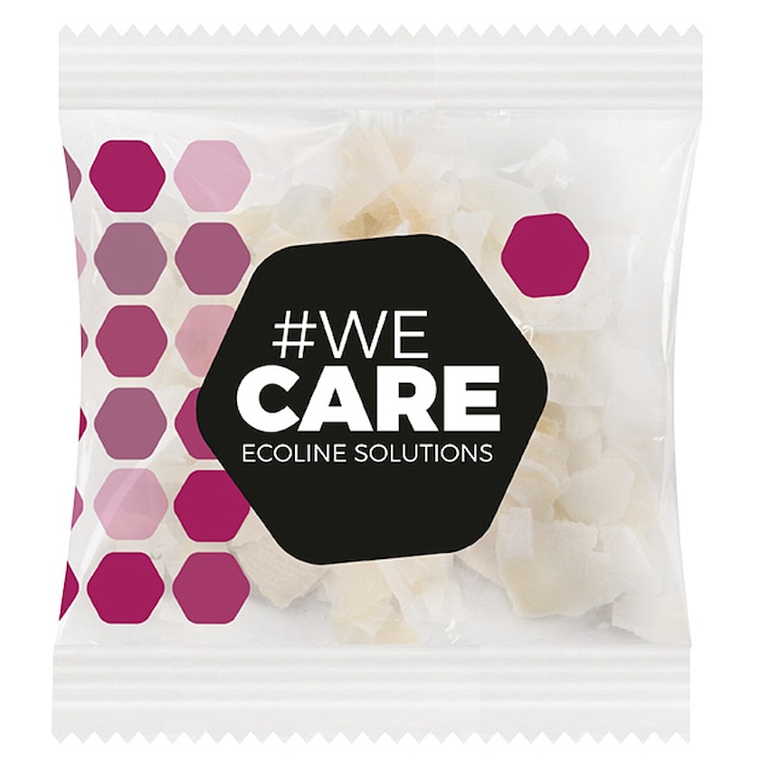 Piccolo bustina di flowpack con chips di banana o cocco. Un'alternativa salutare! L'intero pacchetto è stampato secondo i vostri desideri