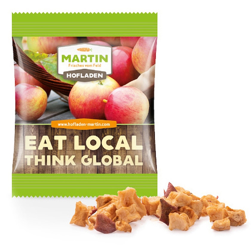 Piccolo pacchetto di mela essiccata a cubetti. Un'alternativa salutare e vegana. L'intero pacchetto viene personalizzato secondo i tuoi desideri.