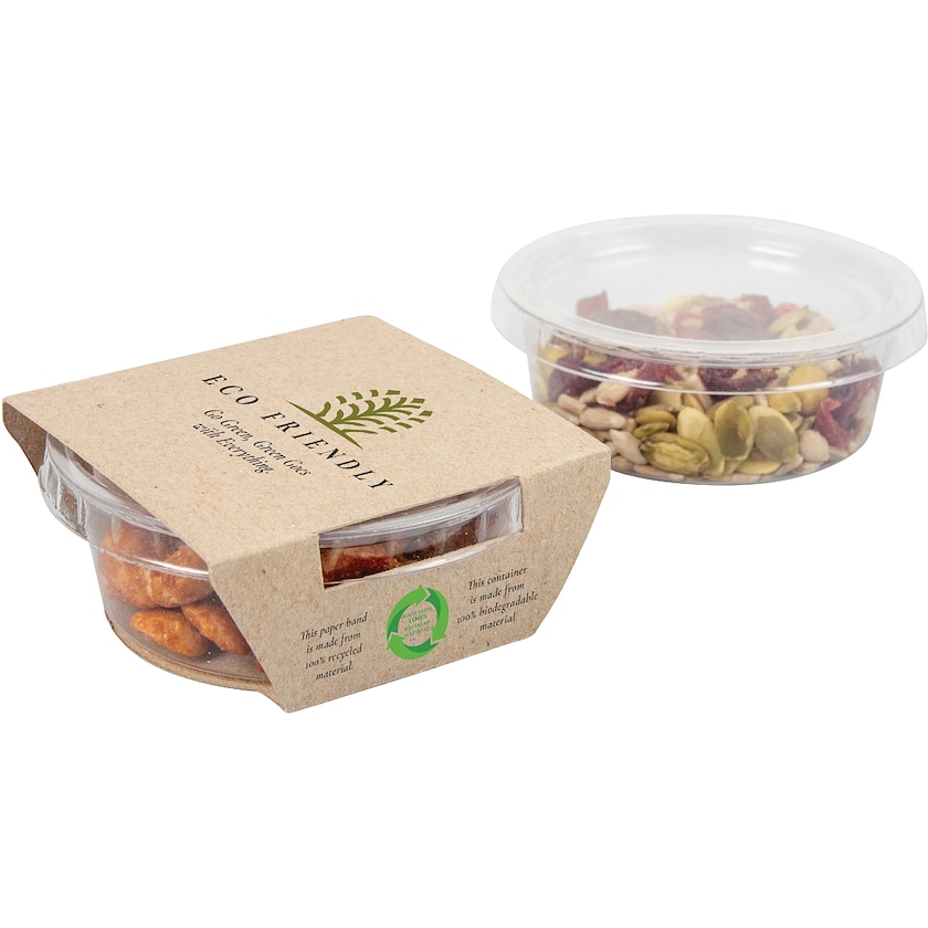 Una merenda salutare in confezione biodegradabile. Scegli tra tante combinazioni diverse. La confezione è realizzata in PLA, che è interamente biodegradabile. La stampa viene realizzata su di un cartoncino color naturale che avvolge la confezione.
