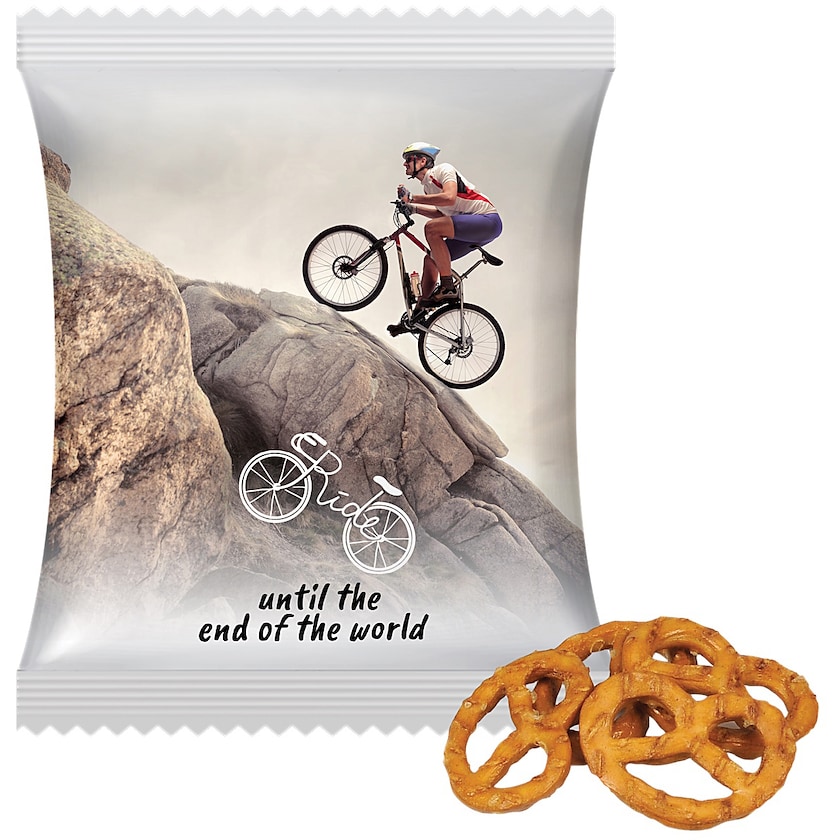 10 grammi di salatini Brezel salati. Consegnato pacchetto in flowpack con la propria stampa. Una bella alternativa alle caramelle in fiera!