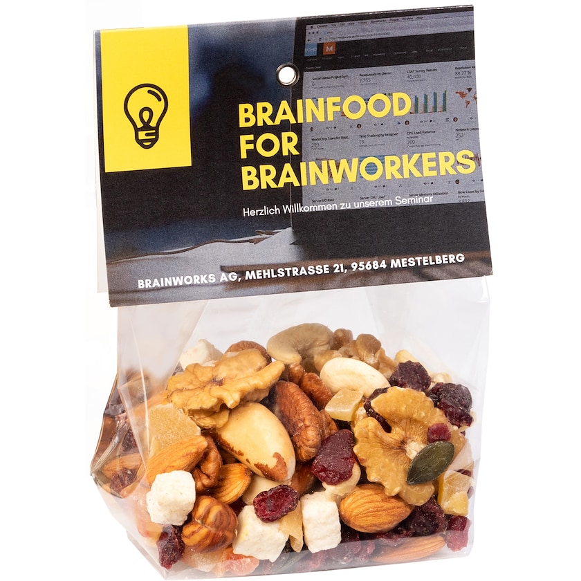 Frutta secca in confezione con etichetta di carta personalizzata. Frutta secca con mirtillo rosso, papaya, ananas, noci e cocco.