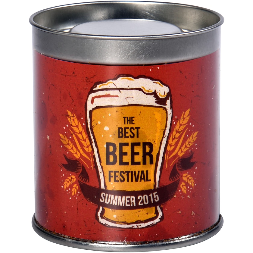 Contenitore di metallo con 40 grammi di snack salati. Il contenitore viene personalizzato con una banda stampata digitalmente. La festa può iniziare!