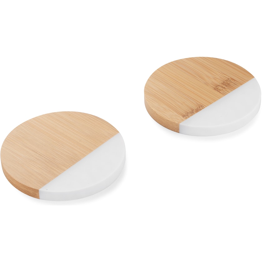 Set di due sottobicchieri in bambù e marmo artificiale. Il materiale è durevole e resistente agli urti. Il set viene consegnato in una confezione regalo in cartone color naturale.