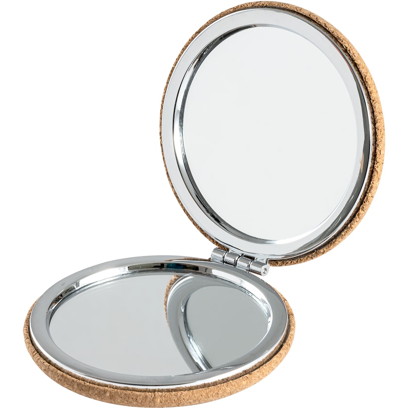 Specchietto rotondo con esterno in sughero. Melinda è dotata di due specchietti e viene consegnata in una custodia di carta color naturale. Il logo viene inciso a laser.