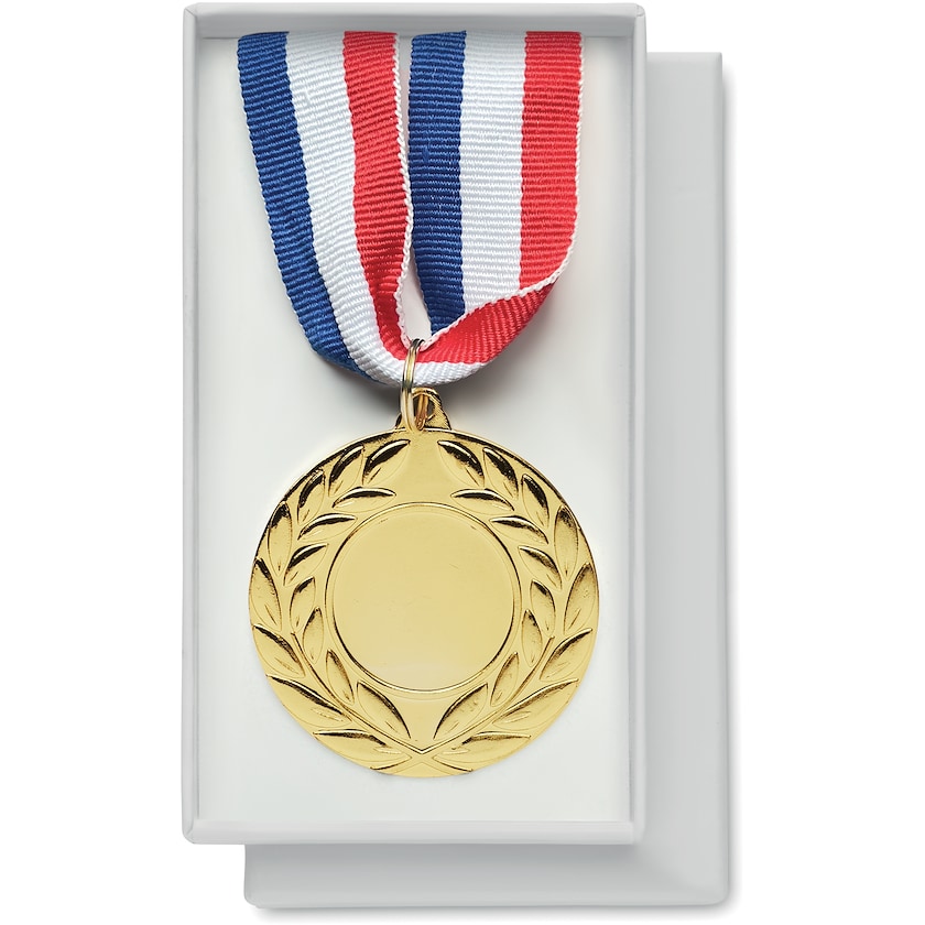 Medaglia disponibile nei valori oro, argento e bronzo. La medaglia ha un nastro nei colori blu, bianco e rosso. La personalizzazione viene realizzata con incisione a laser al centro della medaglia.