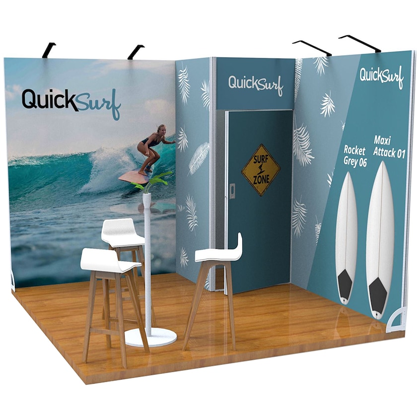 Stand espositivo facile da montare da 9 m2. Il set contiene due moduli da 200 cm, un modulo con una porta, due piedi e una custodia. La stampa viene realizzata su un tessuto che viene steso sul telaio dei moduli e fissato con una fascia in silicone. I telai dei moduli sono realizzati in alluminio anodizzato. Tutti le parti sono segnate in modo chiaro per permettere un montaggio semplice. Il montaggio non richiede nessun attrezzo oltre alla chiave a brugola inclusa. Se vuoi cambiare la stampa dello stand ti basterà ordinare un nuovo tessuto da noi. Luci LED e supporto per TV possono essere acquistati come accessori. Il tavolo, le sedie e il pavimento non sono inclusi.
