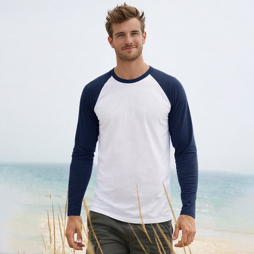 Maglietta a maniche lunghe della marca Fruit of the Loom. Modello da baseball. Confezionata singolarmente in busta di plastica.