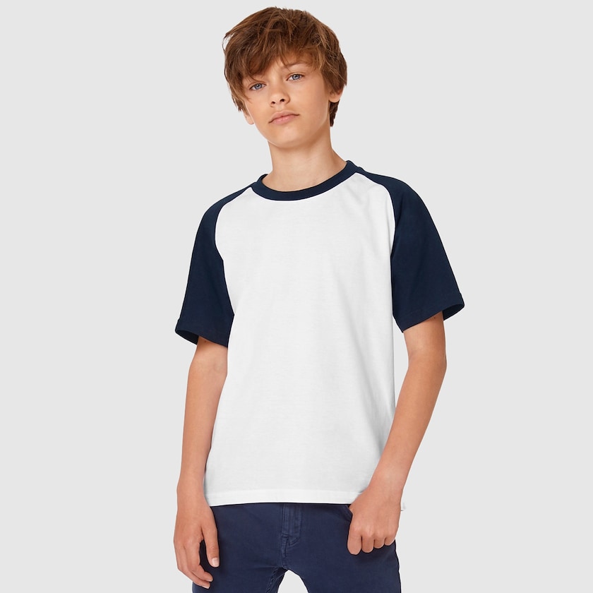 T-shirt per bambini di tutte le età. Modello da baseball. Confezionata singolarmente in busta di plastica.