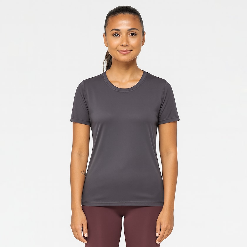 Maglietta da allenamento da donna in fresco tessuto di poliestere. La maglietta ha uno scollo rotondo e un taglio aderente. Il tessuto tiene il corpo al fresco anche durante gli allenamenti più intensi. Disponibile anche in versione da uomo.