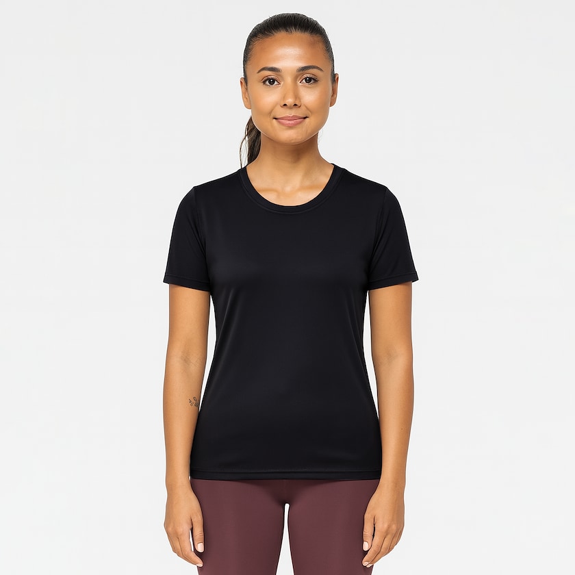 Maglietta da allenamento da donna in fresco tessuto di poliestere. La maglietta ha uno scollo rotondo e un taglio aderente. Il tessuto tiene il corpo al fresco anche durante gli allenamenti più intensi. Disponibile anche in versione da uomo.