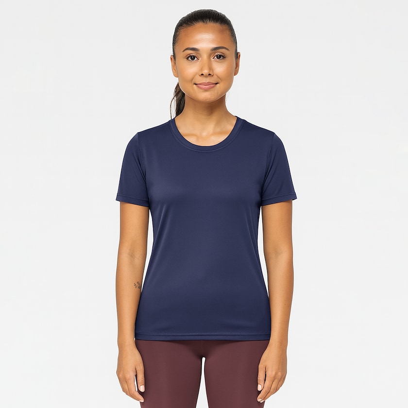Maglietta da allenamento da donna in fresco tessuto di poliestere. La maglietta ha uno scollo rotondo e un taglio aderente. Il tessuto tiene il corpo al fresco anche durante gli allenamenti più intensi. Disponibile anche in versione da uomo.