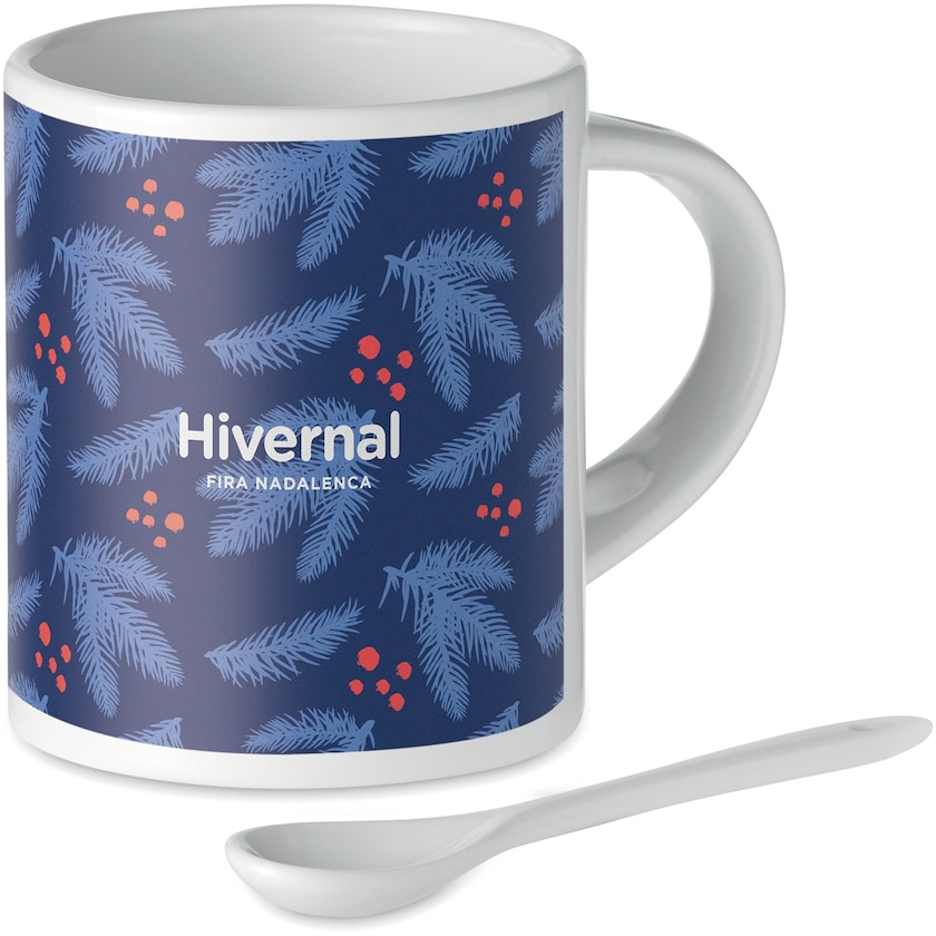 Tazza con stampa fotografica e cucchiaio abbinato. Questa tazza è dotata di un'ampia superficie di stampa che offre ottime possibilità di creare un potente messaggio pubblicitario. Il cucchiaio può essere riposto nel manico della tazza quando non viene usato.