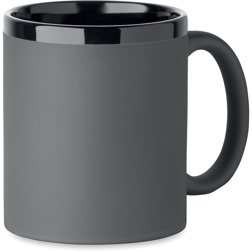 Tazza con superficie soft-touch e parte interna e bordo neri. La personalizzazione viene realizzata con incisione a laser realizzata in nero. Consegnata individualmente confezionata in una scatola bianca.