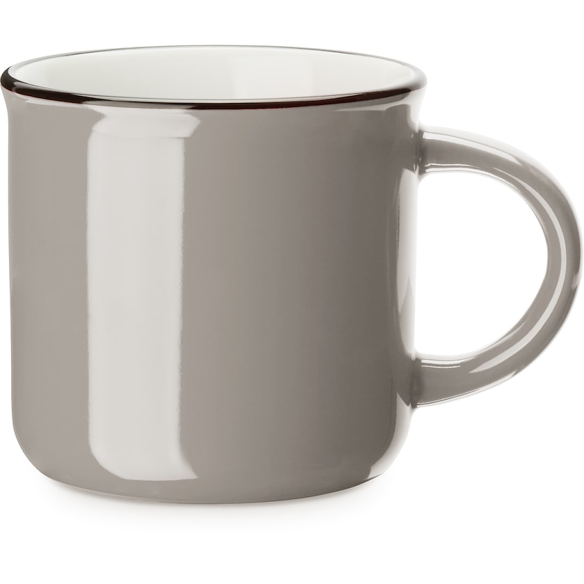 Tazza in ceramica dal bel design vintage. La tazza è acquistabile a partire da sole 25 unità. La stampa è certificata EN12875-1 ed è quindi in grado di resistere ad almeno 125 lavaggi in lavastoviglie. Ogni tazza viene consegnata in una bella confezione regalo. Se si sceglie la stampa a un colore, la superficie di stampa è di ben 174 x 45 mm.