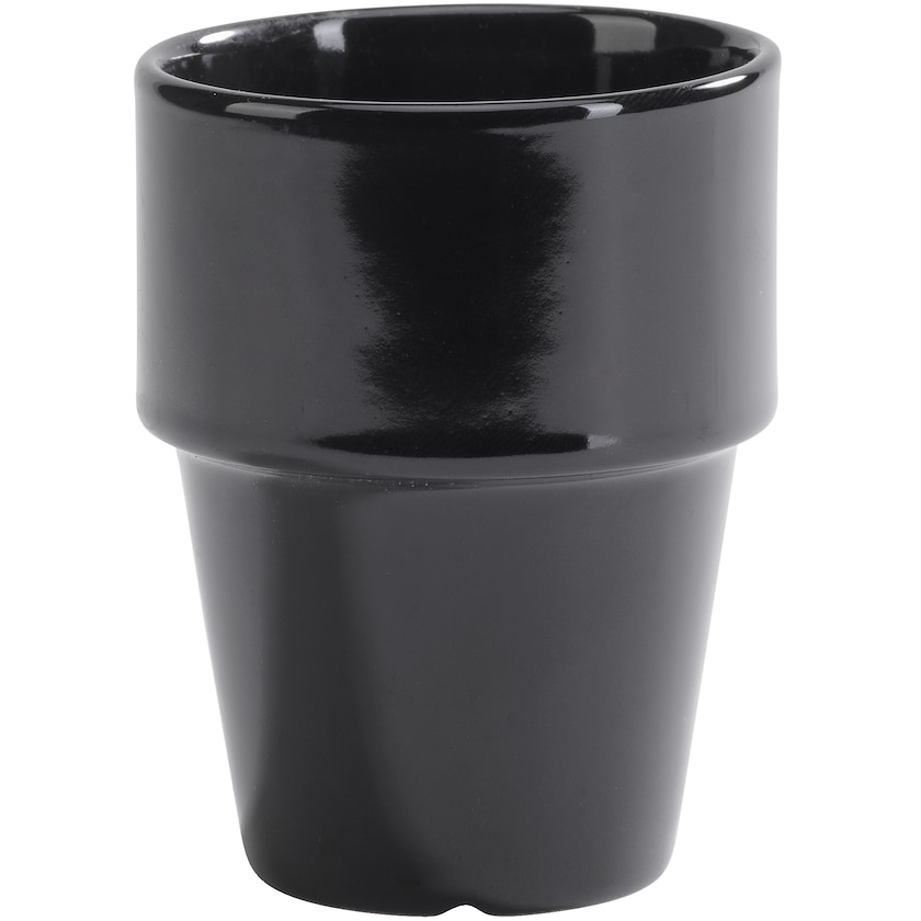 Design moderno e funzionalità si combinano perfettamente in questa tazza. Il fatto che la tazza sia più ampia nella parte superiore la rende facilmente impilabile. In ceramica lucida. Stampa possibile a un solo colore.