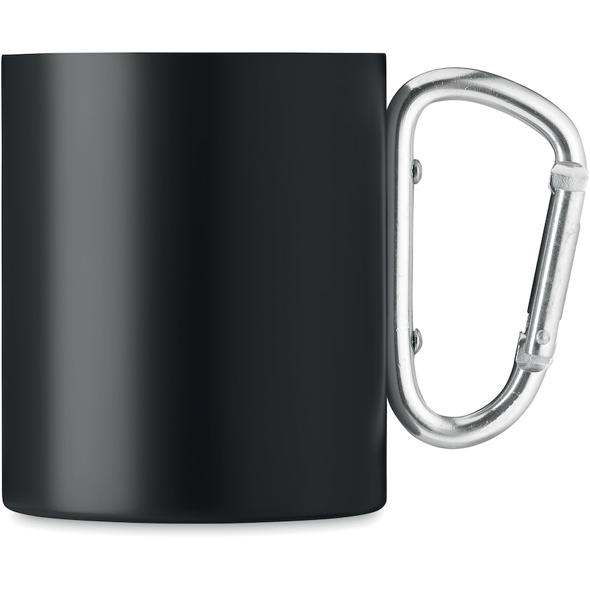 Tazza in acciaio inox con moschettone come manico. Questa tazza è dotata di pareti doppie che permettono di tenere calde le bevande più a lungo.