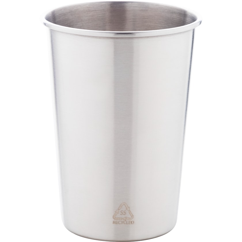 Tazza di metallo in acciaio inox riciclato. La tazza ha una parete singola e ha capacità 35 cl.