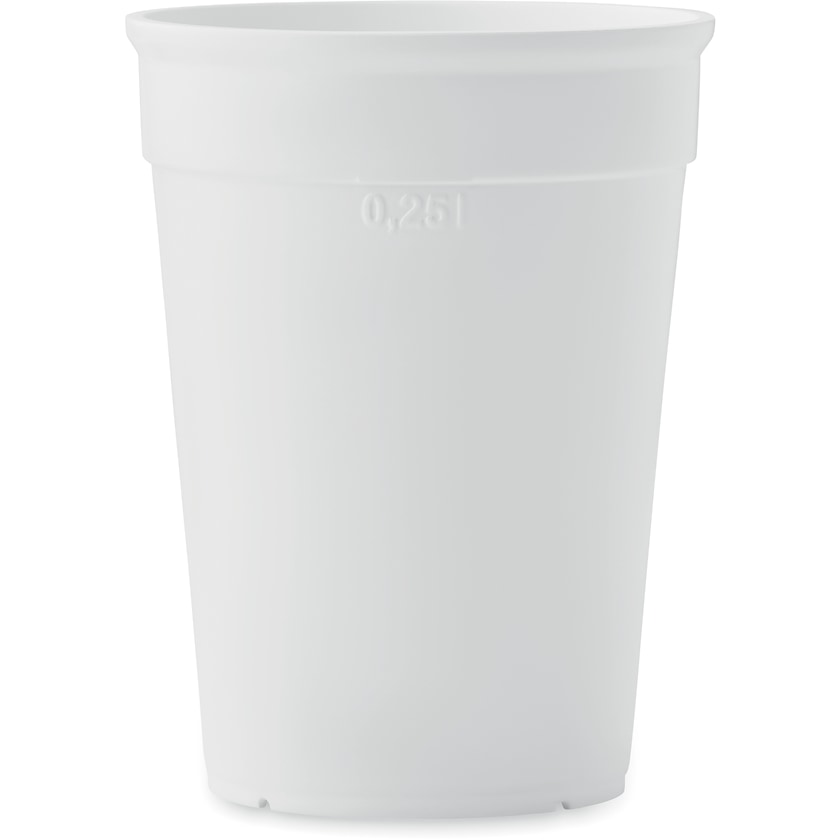 Tazza in plastica in polipropilene riciclato. La tazza contiene 30 cl. Stampa disponibile a un solo colore.