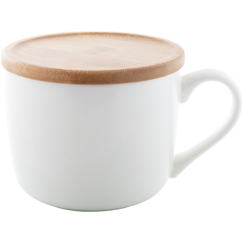 Grande tazza di porcellana con tappo di bambù. Il coperchio può anche essere usato come sottobicchiere. La tazza viene confezionata singolarmente e consegnata all'interno di una confezione regalo.