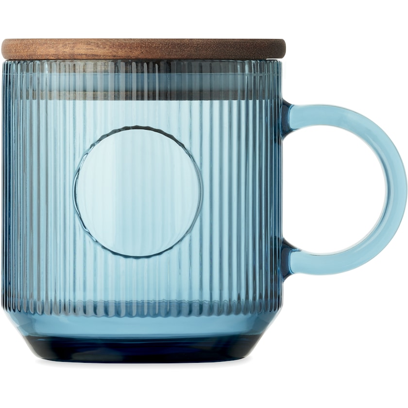 Bella tazza in vetro a coste con tappo in legno. La stampa è realizzata sulla superficie circolare liscia sul davanti della tazza. Il tappo in legno è realizzato in legno di acacia ed è certificato FSC.