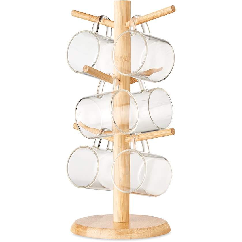 Set di 6 tazze in vetro con supporto decorativo in bambù. Le tazze sono realizzate in vetro borosilicato resistente e possono quindi contenere bevande molto calde. Il supporto per le tazze viene consegnato smontato. Il prezzo di stampa si riferisce alla personalizzazione del supporto oppure di una delle tazze. L'incisione a laser è solo possibile sul supporto.