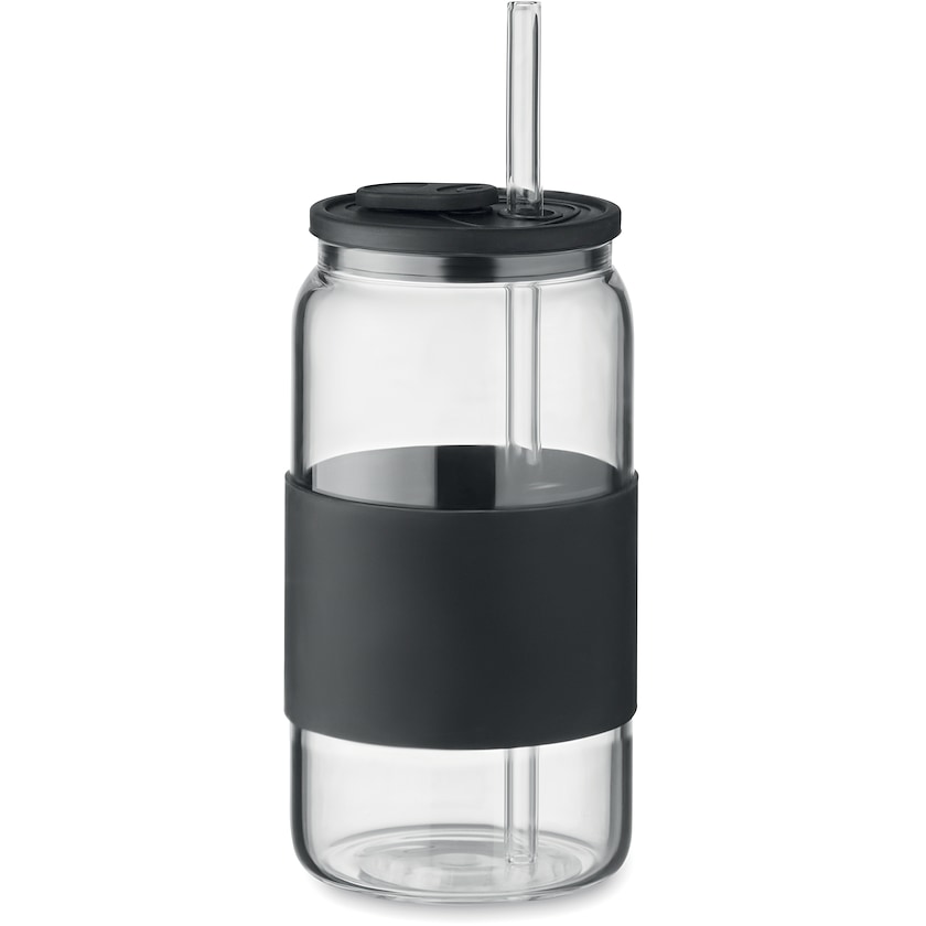 Tazza in vetro con tappo e impugnatura in silicone. La tazza di vetro, inclusa la cannuccia, sono realizzate in resistente vetro borosilicato.