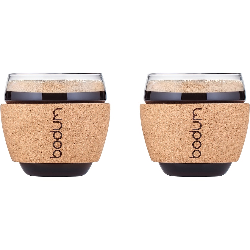 Set con due bicchierini di vetro da 35 cl di marca Bodum. Questi bicchierini di vetro sono ricoperti da una fascia di sughero che gli corre intorno. Il prezzo dell'incisione a laser si riferisce alla personalizzazione di una delle due tazzine.