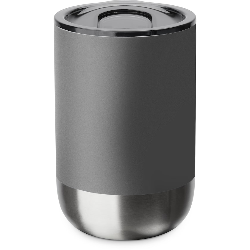 Tazza termica dalle forme morbide in acciaio inox riciclato. Mantiene alla loro temperatura le bevande calde per 3 ore e fredde per 6 ore. Il tappo è dotato di una pratica apertura a chiusura ermetica. La tazza viene consegnata all'interno di una confezione regalo di cartoncino riciclato.