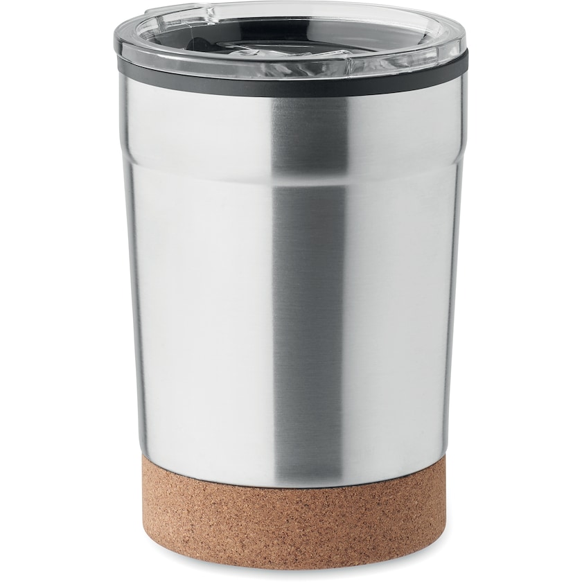 Tazza termica con esterno in acciaio inox e fondo in sughero. La tazza ha pareti doppie. L'interno è realizzato in polipropilene. Il tappo ha un foro estraibile per bere. Chiusura ermetica.