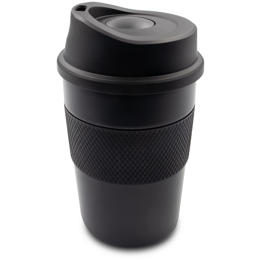 Tazza termica in acciaio inox. La tazza ha pareti doppie con isolamento sottovuoto, lato interno e esterno in acciaio inox e un tappo in plastica con comodo foro per bere che si può aprire e chiudere. Intorno alla tazza si trova una comoda impugnatura in gomma.