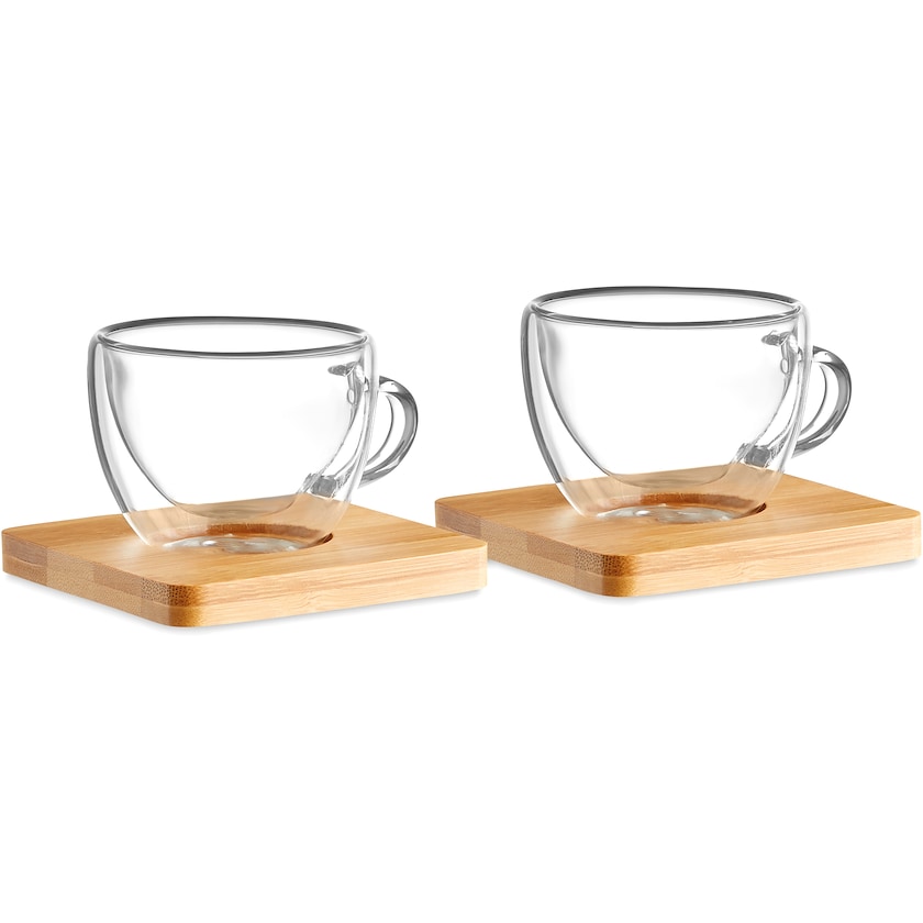 Set di due tazzine da caffè con sottobicchiere in bambù. I bicchieri hanno una capienza di 9 cl ciascuno. Il set viene consegnato all'interno di una bella confezione regalo. Il prezzo di stampa si riferisce o alla stampa sulla fascia di carta che avvolge la confezione regalo o alla stampa su uno dei due sottobicchieri.