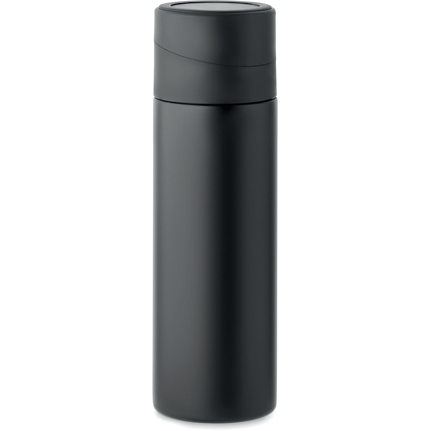 Thermos unico con supporto per cellulare sul tappo. Il thermos ha pareti doppie con isolamento sottovuoto ed è realizzato in 90% acciaio inox riciclato e 10% acciaio inox. Il tappo ha un anello di silicone che mantiene il telefono al suo posto.