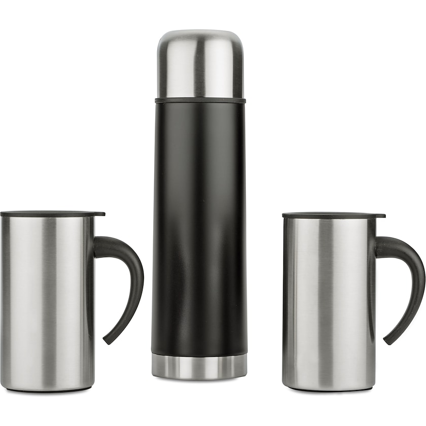 Set con un thermos e due tazze in acciaio inox. Il thermos contiene 50 cl e le tazze 26 cl l'una. Viene consegnato in una bella scatola regalo.