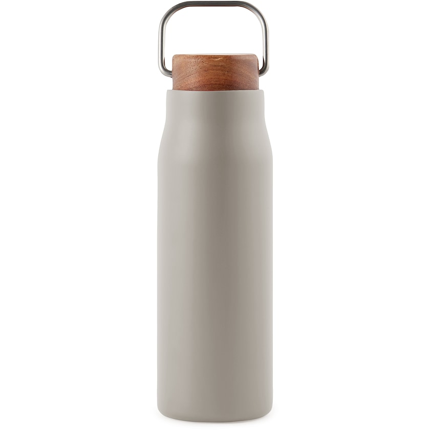 Piccolo thermos in acciaio inox riciclato certificato RCS. Locco ha un tappo a vite in legno di acacia. Grazie alle pareti doppie le bevande sia calde che fredde si mantengono alla loro temperatura più a lungo.