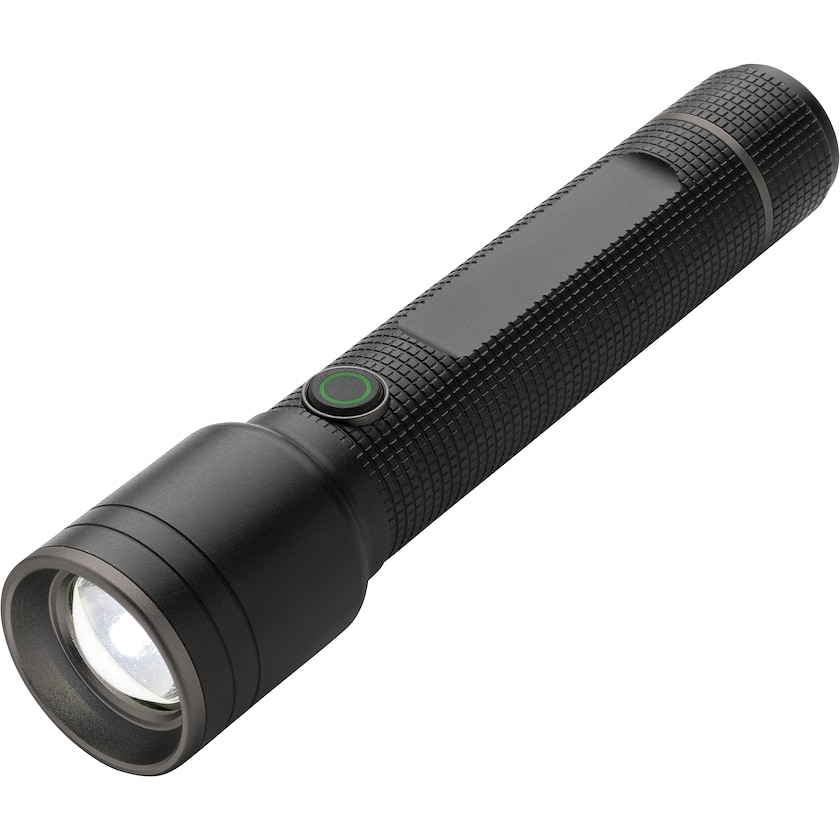Esclusiva torcia in alluminio riciclato. La torcia è ricaricabile attraverso presa USB, ha intensità 800 lumen e un cono di luce che raggiunge 500 metri. La luce ha cinque modalità. La torcia può essere utilizzata 8 ore con una ricarica. Grazie alla certificazione IP4 la lampada può essere utilizzata all'aperto senza problemi.